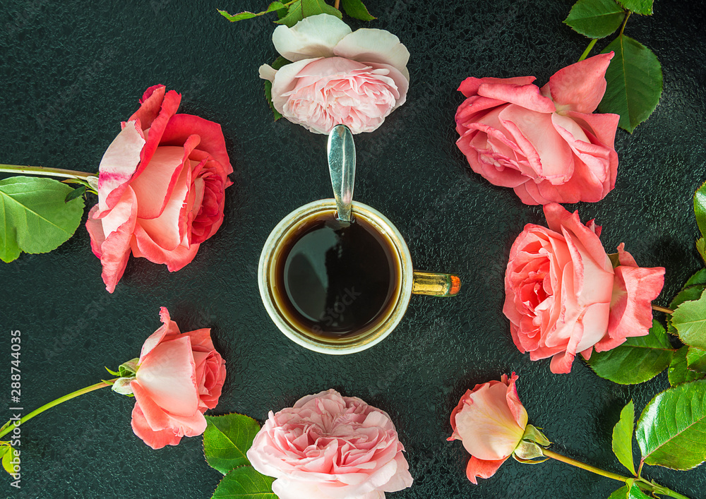 Beautiful Coffee Break Concept Vintage Cup Of Coffee On The Black Background With Pink Roses Flowers Top View Stock Photo Adobe Stock